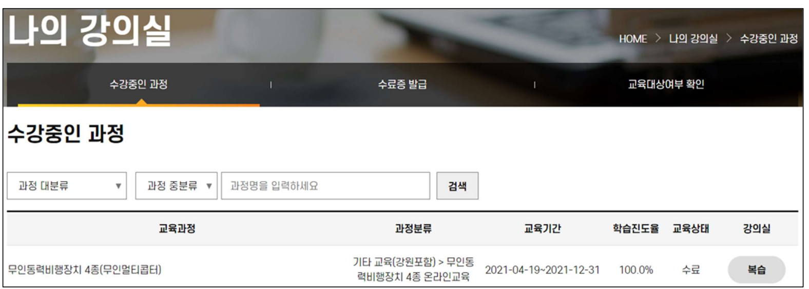 회원가입 후 로그인- > 수강신청 -> 무인동력비행장치 4종(무인멀티콥터) 신청 해줍니다.