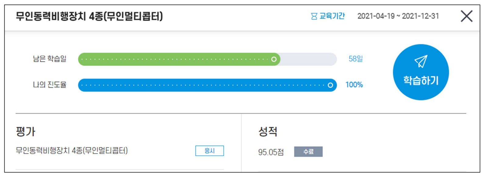 수강 후 평가 응시를통해 70점이상 취득시 드론 4종 자격증 교육이수증 발급 가능합니다.