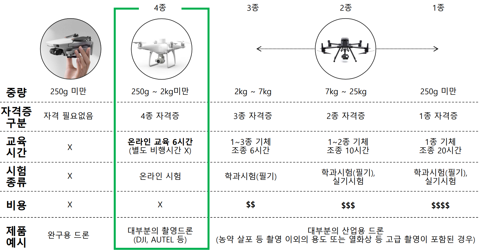 1종이 가장 상위 기종이며, 각 드론 자격증보다 하위 수준의 기종까지 조종 가능합니다.