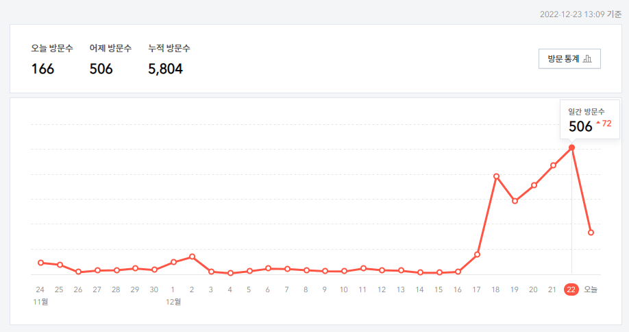 1. 블로그 방문자 수 현재 티스토리 블로그 수익화 과정 중에 있습니다! (티스토리 블로그 에드센스달린지 22일쨰) 지난달 초 새로운 파이프라인 구축을 위해 시작했던 티스토리 블로그.... 12월 6