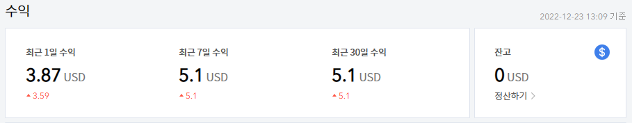 처음 시작했을 때 첫 번째 목표였던 주 수익 이외에 다른 파이프라인으로 1달러라도 벌어보자 였는데, 일단 달성 성공!(하지만 외화통장 요청을 못 받은 건 비밀;;; 얼마 넘어야 외화통장 만들라고 우편이 오죠?;;;ㅎㅎㅎ)