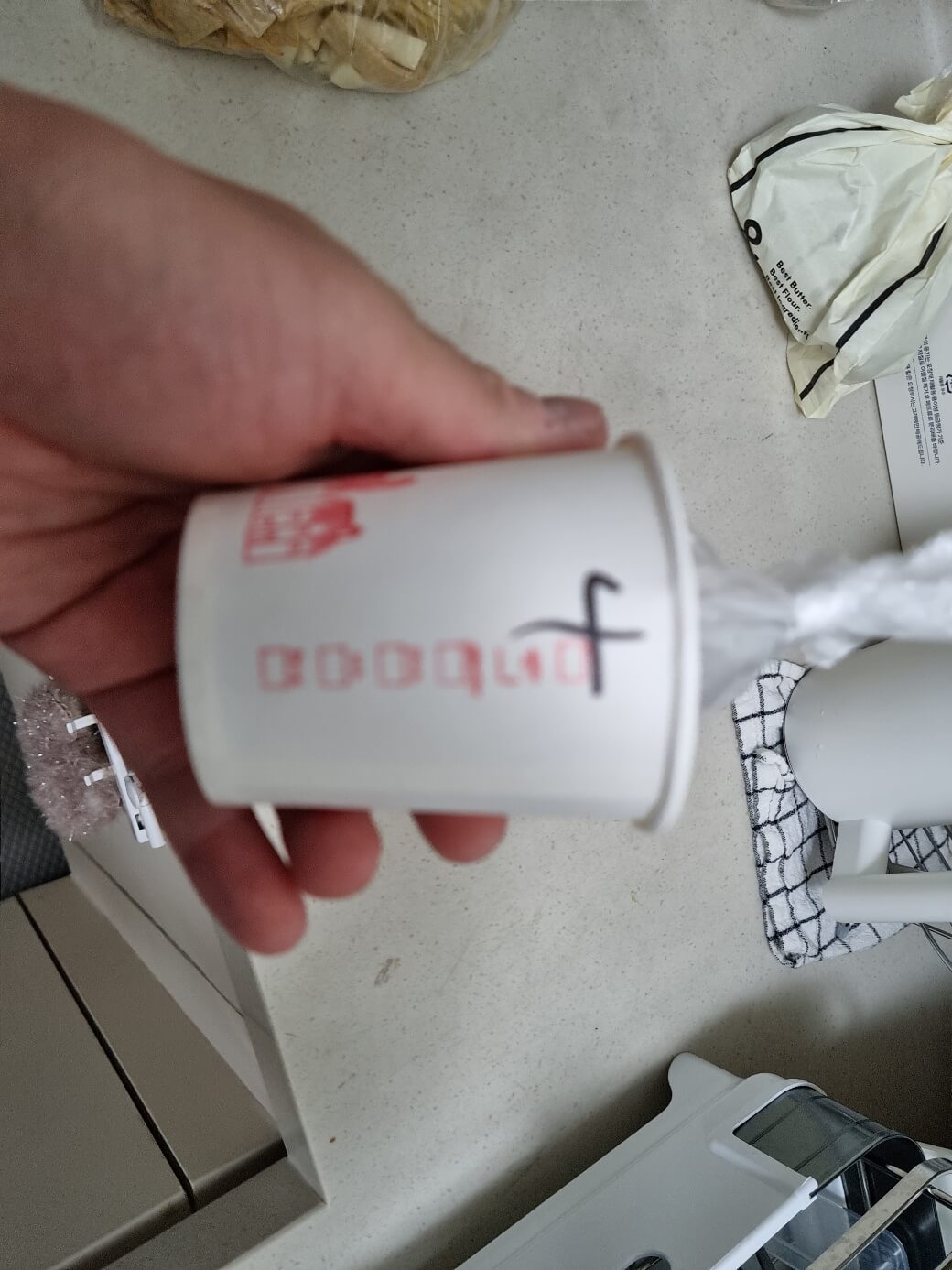 2. 종이컵 안에 사장님이 주신 소스가 있습니다. 소스가 남지 않도록 잘 털어서 냄비에 있는 물에 넣어줍니다.