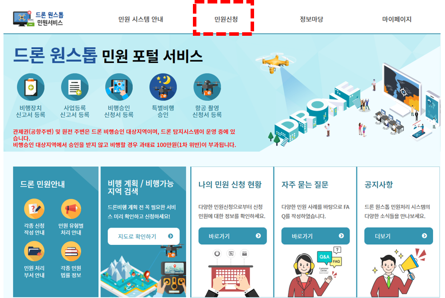 1. 드론 원스톱 민원 포털서비스에 들어가시면 위와같은 화면이 보이실 겁니다. 일단 상단에 민원신청 탭을 눌러주세요.