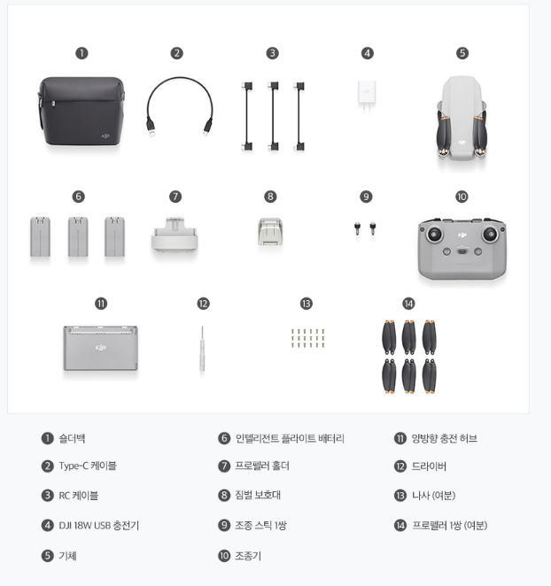 Mavic Mini2를 구입하신다면, 기본 키트와 플라이모어 키트가 있는데, 어느 정도 밖에서 시간 제약 없이 즐기시려면 플라이모어 키트를 추천합니다. 나중에 플라이모어 키트에 있는 구성품을 따로 사려고 하면 돈이 더 많이 들어갈 수가 있습니다. 더 많은 배터리 수명을 원하고 90분의 비행시간을 할 수 있다는 점 참고하시면 되겠습니다.