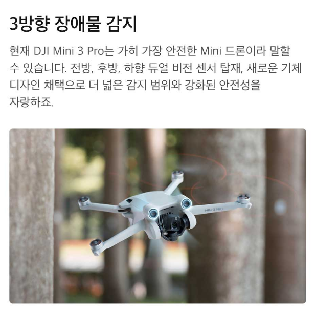 첫째, 익숙하지 않은 드론 조종으로 위험에 빠지고 싶지 않은 초보자를 위해 드론 내부에 3방향 장애물 회피 시스템을 포함시켰습니다. (센서가 있다고 하더라도 얇은 전선이나 나뭇가지는 인식이 쉽지 않기 때문에 조심해야 됩니다.)