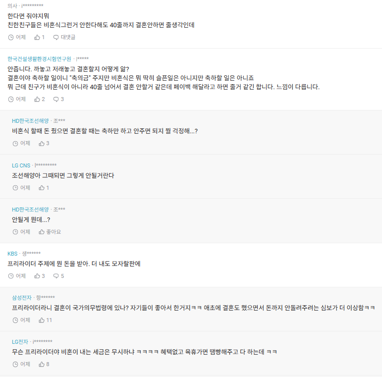 -다른 이용자들은 축의금을 주는 것은 사회생활의 일부로 보기도 하며, 실제로 축하의 의미로 주는 사람은 적다는 의견을 내놓았습니다.