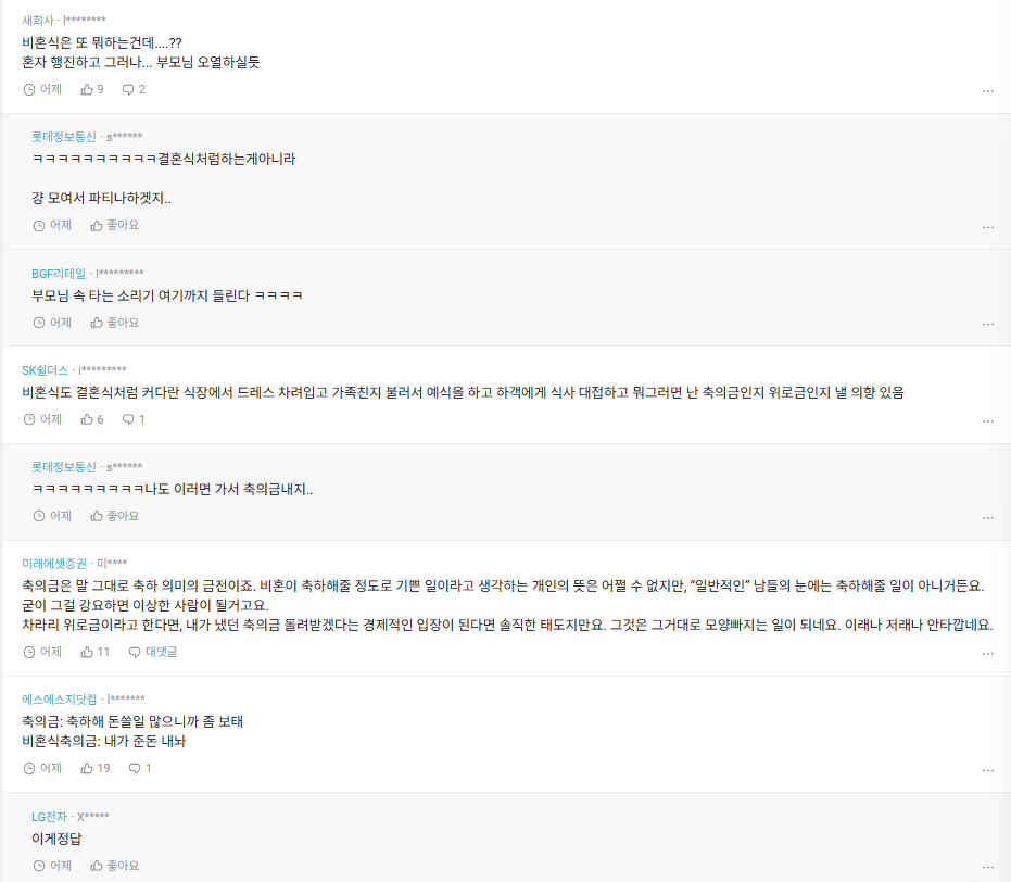 결론적으로, 비혼식에 대한 의견은 사용자마다 크게 갈렸으며, 대부분은 비혼식 자체를 비판하는 반응을 보였지만, 일부는 이해하거나 지지하는 입장을 보였습니다.