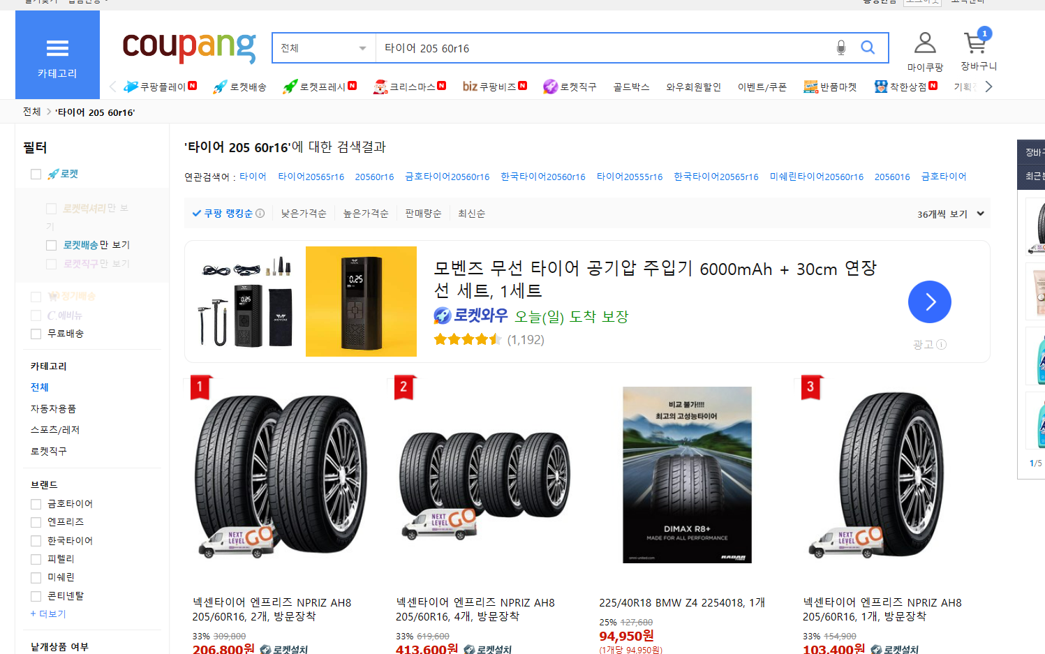 2. 쿠팡에서 205 60r 16 사이즈를 입력하시면 많은 타이어가 나오는데요. 제가 추천해 드리고 싶은 제품은 넥센 엔프라이즈 제품입니다.