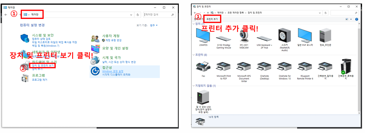 - 제어판 > 장치 및 프린터 > 해당 프린터가 '오프라인' 상태인지 확인 후 ‘온라인’으로 전환