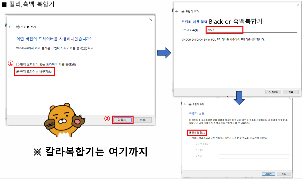 → 홈페이지에서 받은 드라이버 폴더 내 INF 파일 선택 - 프린터 이름 지정 → 설치 완료
