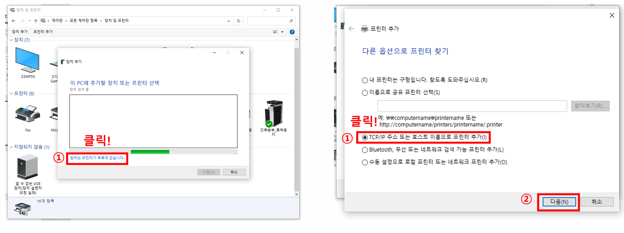 → [프린터 추가] 클릭 - ‘원하는 프린터가 목록에 없습니다’ 클릭