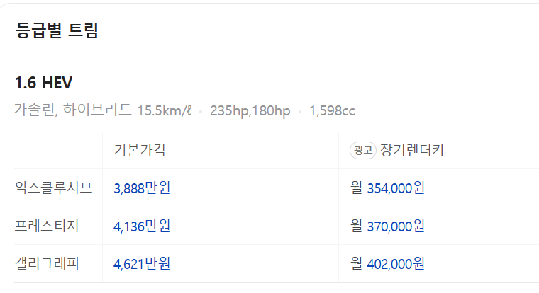 (2) 프레스티지: 중간 등급, 가격 4279만원. 익스클루시브 트림의 기능에 추가로 더 많은 편의 사양과 고급 기능이 포함되어 있습니다. 좀 더 편안한 주행 경험을 제공하며, 다양한 옵션을 통해 사용자 맞춤 설정이 가능합니다.