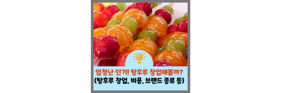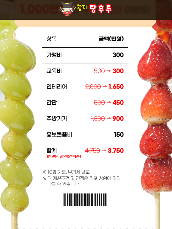 탕후루 전문점 창업비용은 3500 ~ 6800만원대로 비교적 다른 프랜차이즈 전문점 창업비용에 비해 저렴한 창업비용을 자랑합니다.