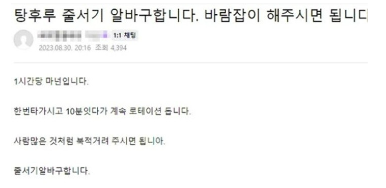 탕후루 매장에 손임이 많은 것처럼 홍보하기 위해 바람잡이 알바생을 모은다는 글이었습니다.