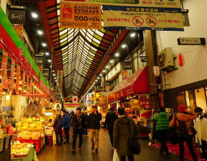 오사카의 부엌이라고 불리는 구로몬 시장은 신선한 해산물과 다양한 일본 음식을 맛볼 수 있는 곳입니다.