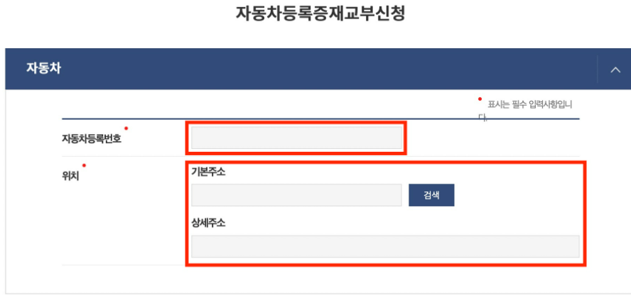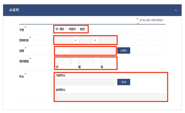 -필요한 차량 정보와 신청자 정보를 입력합니다. 이 때, 차량등록번호와 소유자의 성명, 주소 등이 필요하니 미리 준비해두세요.