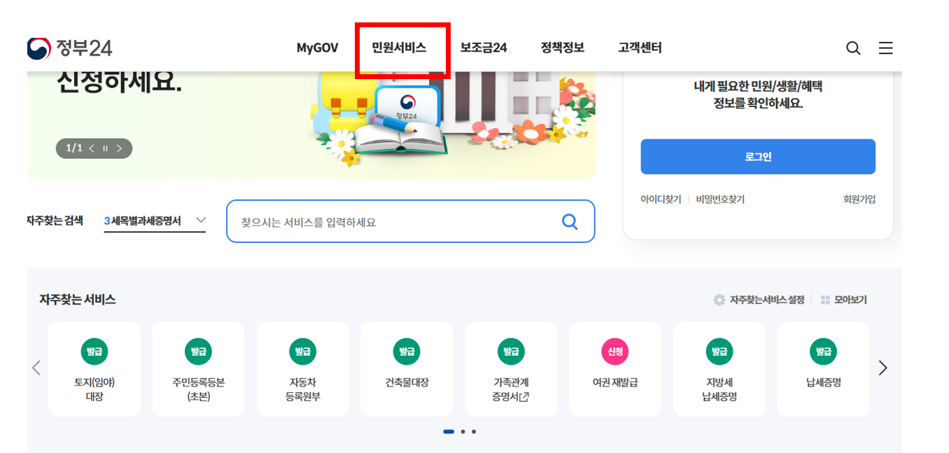 정부24는 다양한 정부 서류를 온라인으로 신청할 수 있는 포털이에요. 자동차등록증도 여기서 재발급 받을 수 있습니다.