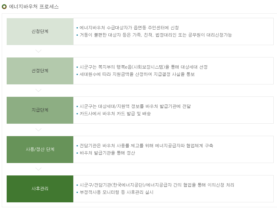 겨울철과 여름철 에너지 취약계층을 대상으로 에너지 바우처를 제공해 전기, 도시가스, 지역난방, 등유, 온수 등을 지원하는 제도다.