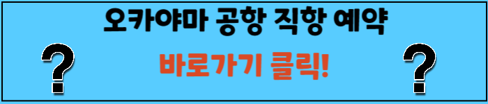 오카야마 공항은 인천국제공항에서 직항이 가능합니다. 항공편은 주로 저녁에 출발하며, 비행 시간은 약 1시간 30분입니다.