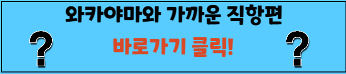 와카야마현은 국제적으로는 직항이 없으나, 간사이 국제공항을 이용하면 매우 편리합니다. 간사이 공항에서 와카야마까지는 자동차로 약 1시간이 소요됩니다.