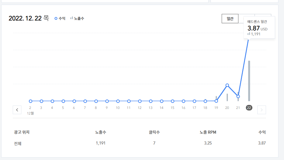 지난달 초 새로운 파이프라인 구축을 위해 시작했던 티스토리 블로그.... 12월 6일에 에드센스 달린 후  열심히 하고 있는데요... 그동안 방문자 및 수익이 처참하다가, 17일~18일부터 소폭 오르더니 이제는 300~500명대를 왔다 갔다 하고 있네요.