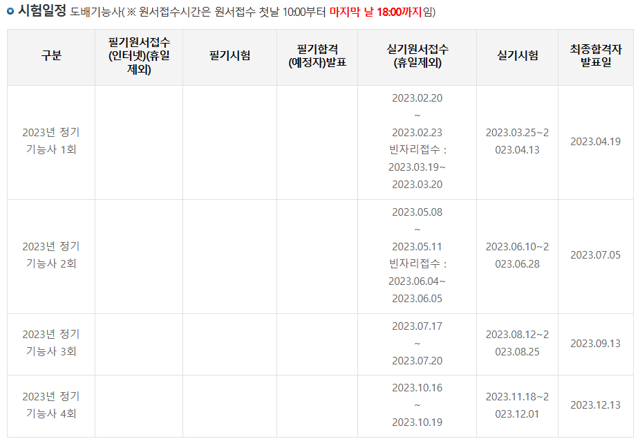 도배 기능사 실기 시험은 1년에 총 4번 치뤄집니다. 아래는 2023년 도배 기능사 시험일정입니다. 올해 다 가기전에 도배 기능사 시험에 도전해 보는것은 어떨까요?