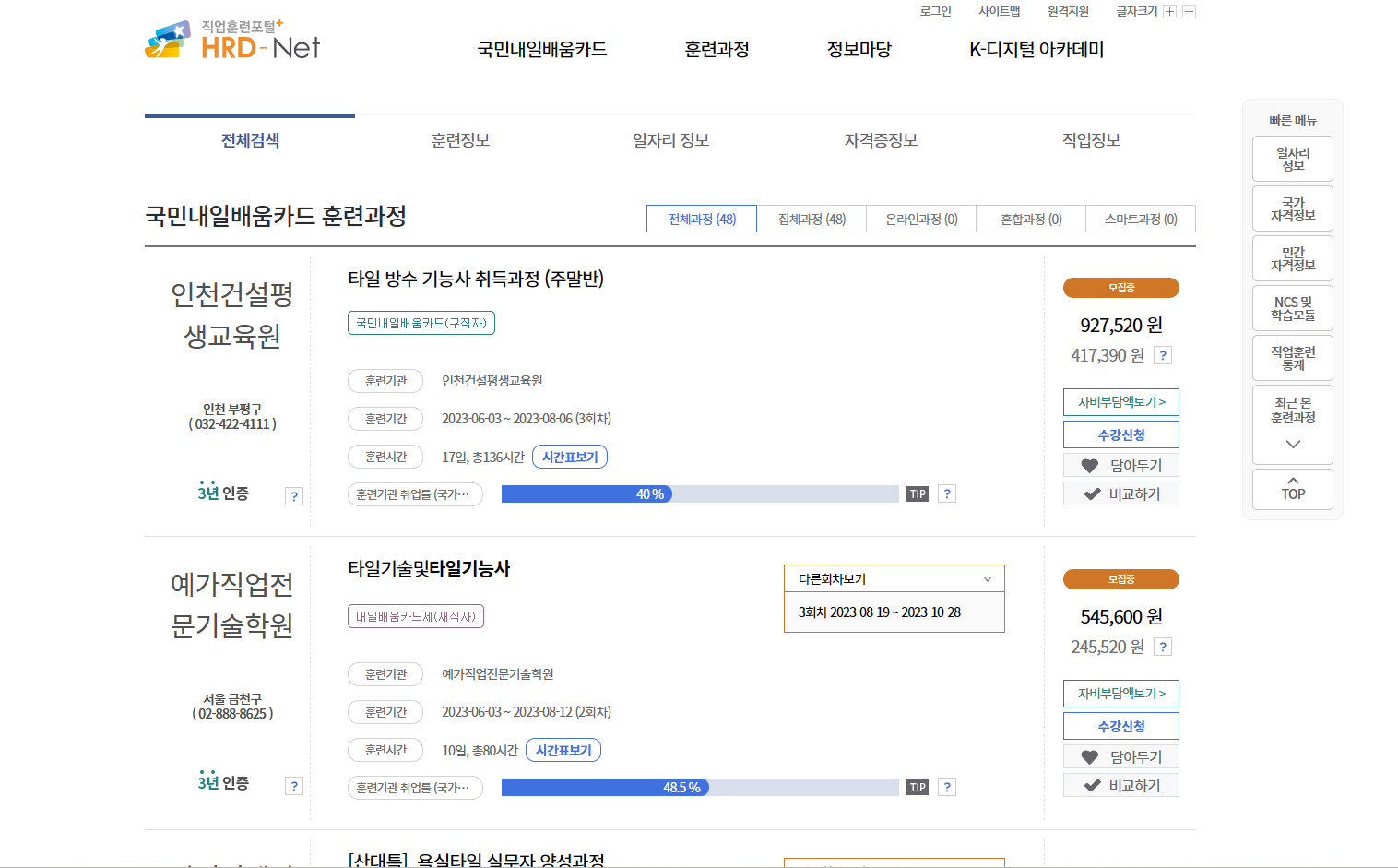 노동부 산하 직업훈련포탈에 들어가시면 내일배움카드훈련과정 학원들을 확인 하실 수 있습니다. 국비지원을 받으면 교육비를 부담 없이 자격증을 취득할 수 있습니다.