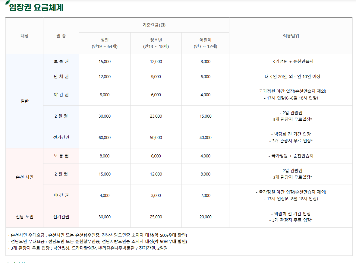 -전기간권은 박람회장 및 3개 관광지(낙안읍성, 뿌리깊은나무 박물관, 드라마촬영장)를 박람회 전기간 동안 자유롭게 입장 가능