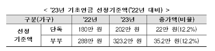 또한 23년 올해부터는 수급 대상자 선정 기준액이 전년 대비 12% 상향 조정되어 더 많은 사람들이 혜택을 받을 수 있게 되었어요.