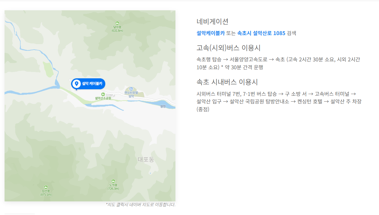가장 쉬운 방법은 내비게이션에 '설악케이블카' 또는 "속초시 설악산로 1085'"를 검색하는 거예요. 바로 원하는 목적지로 안내해줍니다.