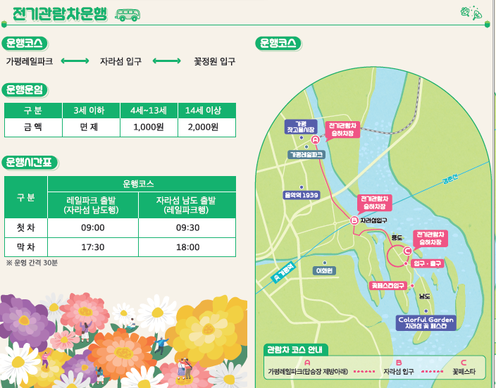 자라섬 남도 입구- 자라섬 캠핑장 안내소 - 잣고을 시장까지 운행합니다. (편도 2천원/현금불가 카드만 가능)