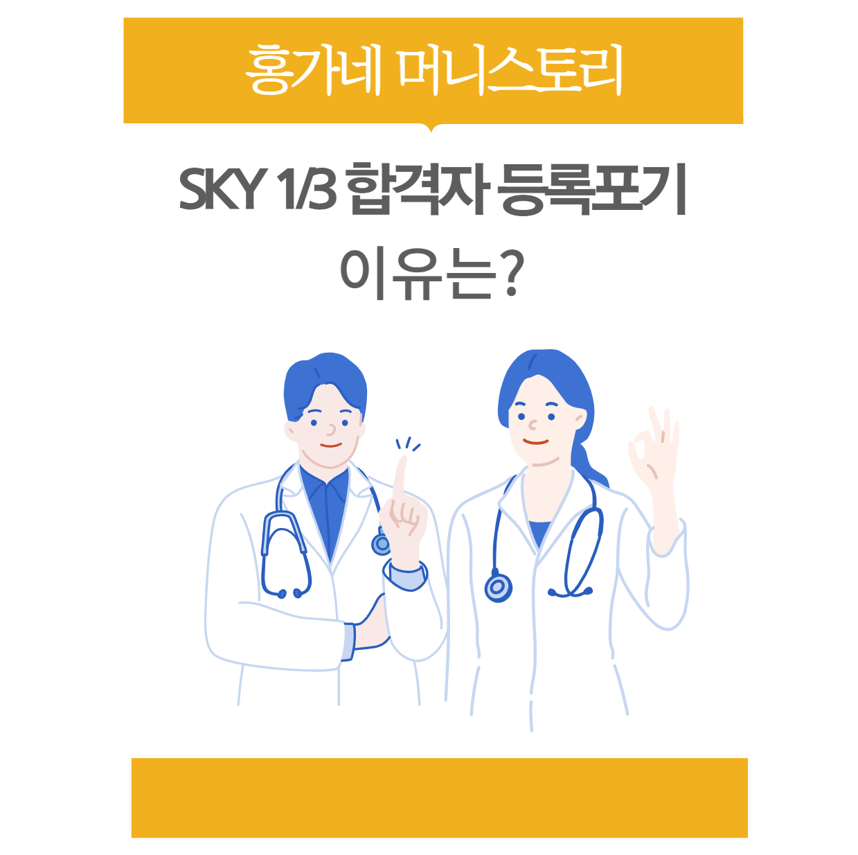 우리나라 최고의 대학 SKY학생 10명 중 4명이 의대로 진학한다는 기사가 보도되었다. 또한 올해 전국 37개 의과대학 정시모집 경쟁률도 3.73대 1로 전년 대비 상승했다고 한다. 왜 이토록 이과생들은 의사라는 직업에 집착하는 것일까? 그리고 이러한 현상 속 문제점은 무엇이며 해결방안은 없는 것일까?