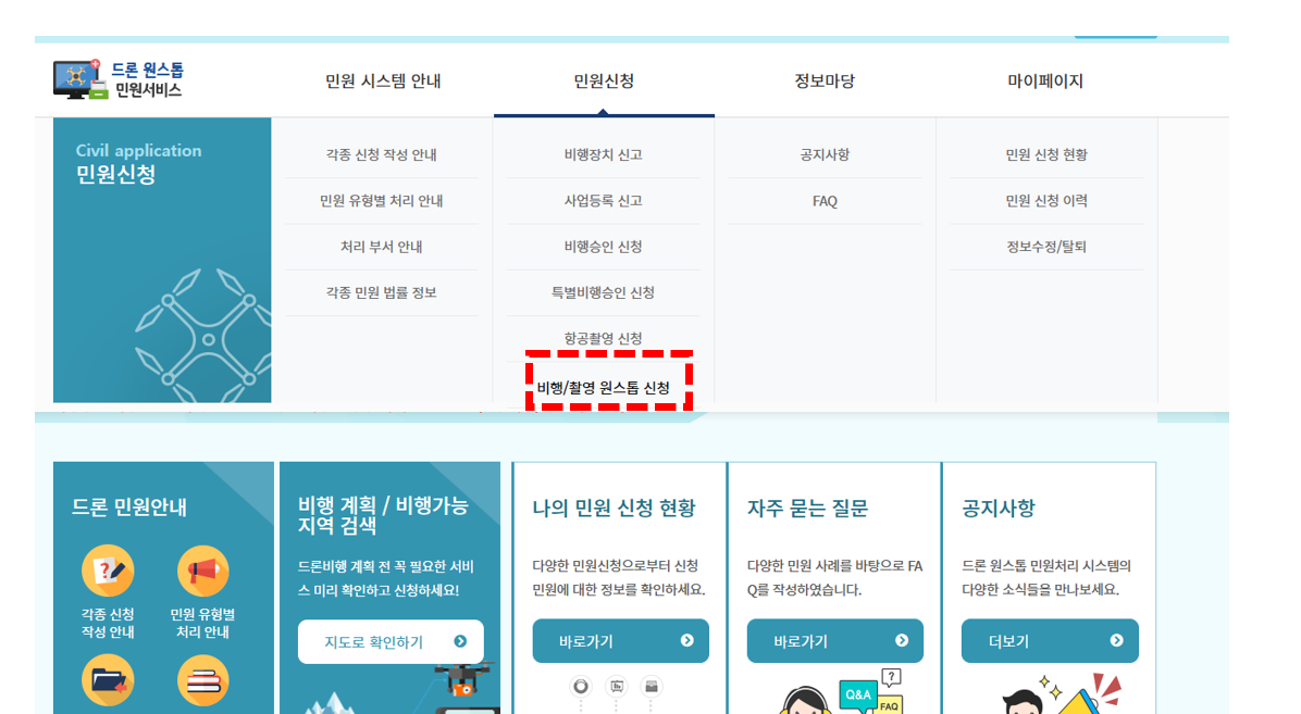 2. 민원신청 메뉴에서->비행촬영 원스톱 신청을 눌러줍시다.