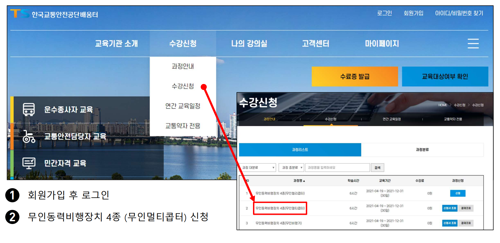 회원가입 후 로그인- >  수강신청 -> 무인동력비행장치 4종(무인멀티콥터) 신청 해줍니다.